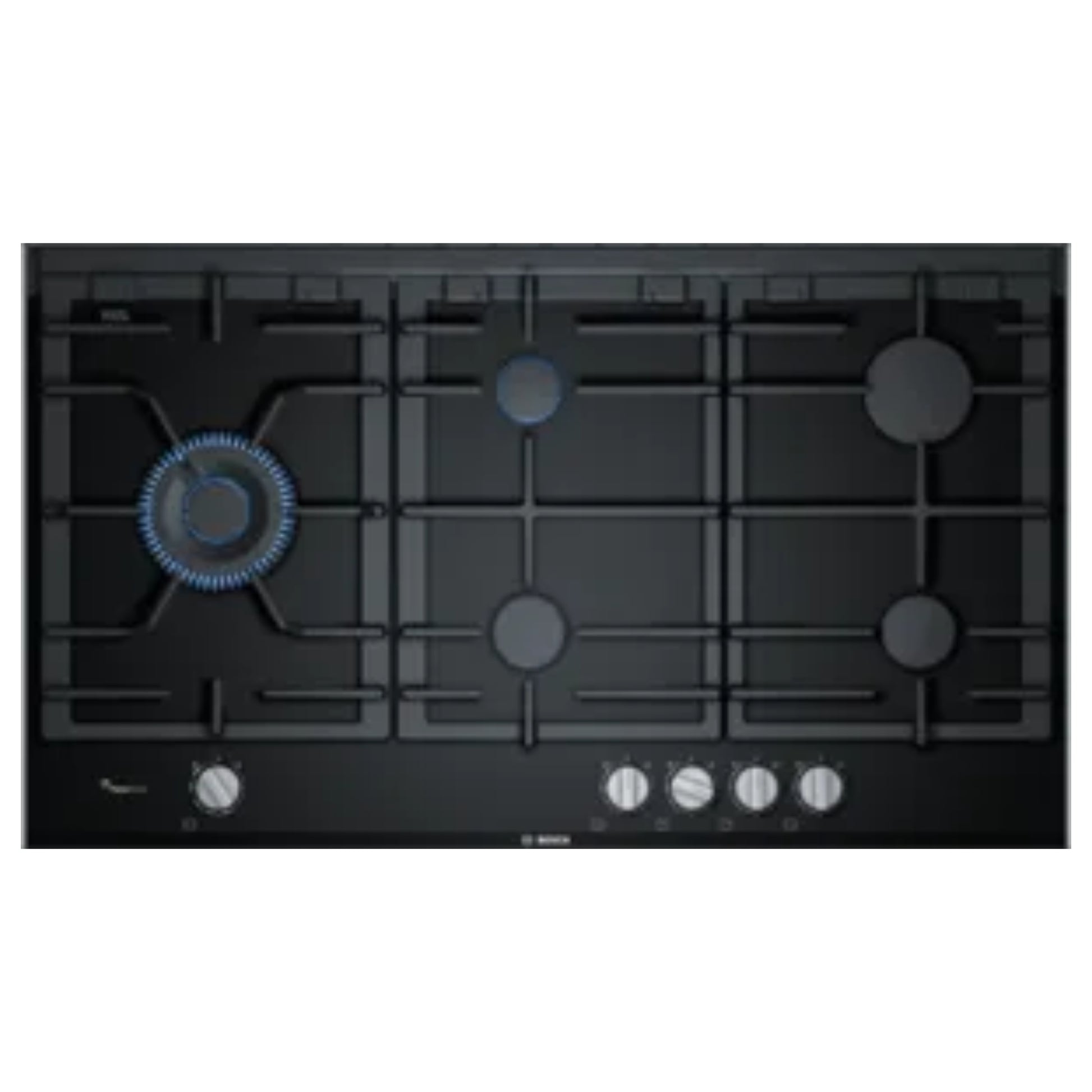 Met zijn royale afmetingen van 91,6 × 52,7 × 5,9 cm (B × D × H) biedt de Bosch PRS9A6B70D voldoende ruimte om comfortabel te koken. De keramische glasafwerking in diep zwart geeft de kookplaat een moderne uitstraling die moeiteloos in elke keukenstijl past. De massieve gietijzeren pannendragers bieden stabiliteit en een professionele uitstraling, terwijl ze eenvoudig te verwijderen en schoon te maken zijn. De bediening met draaiknoppen zorgt voor directe controle, wat essentieel is bij het koken met gas.