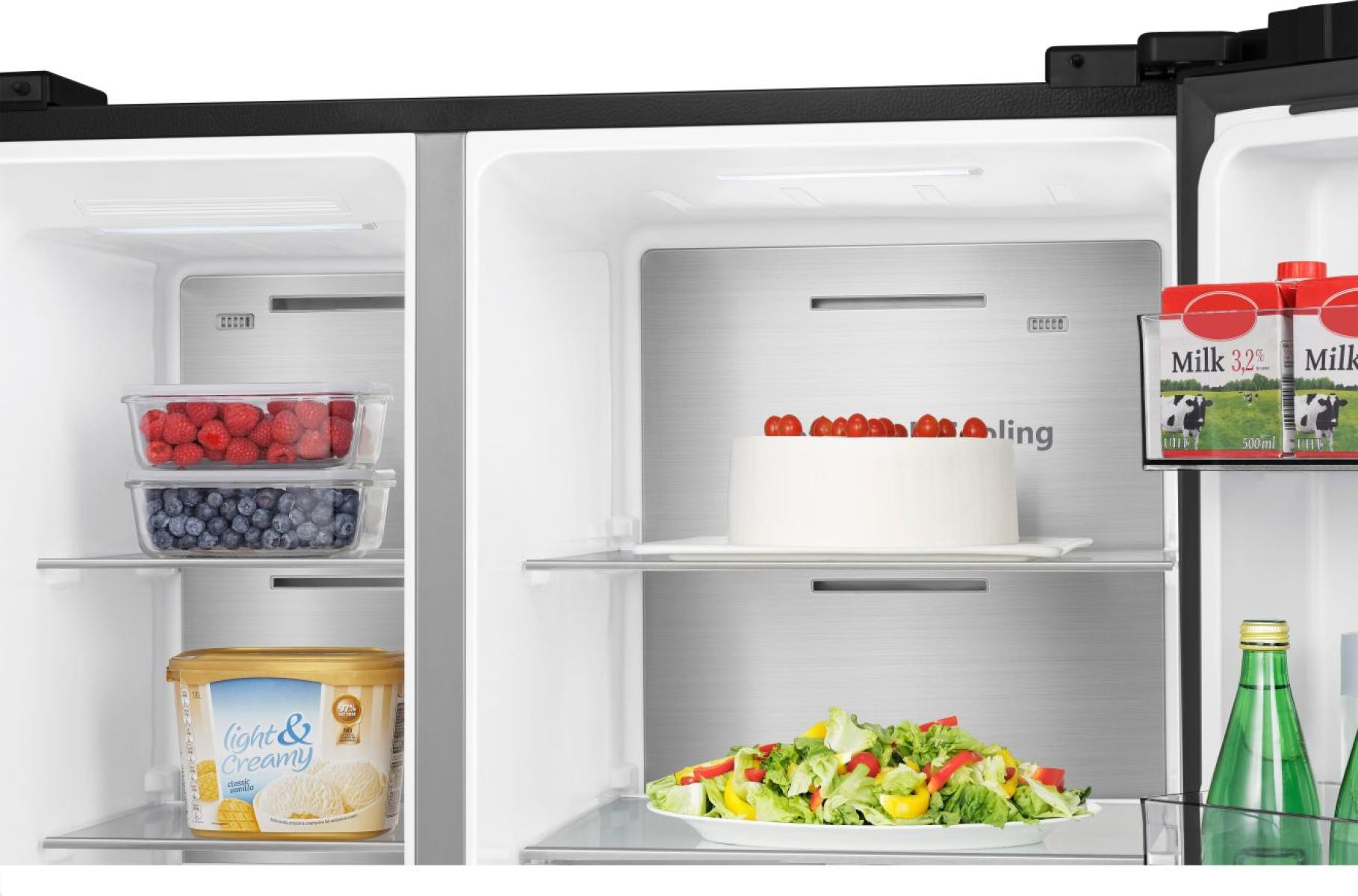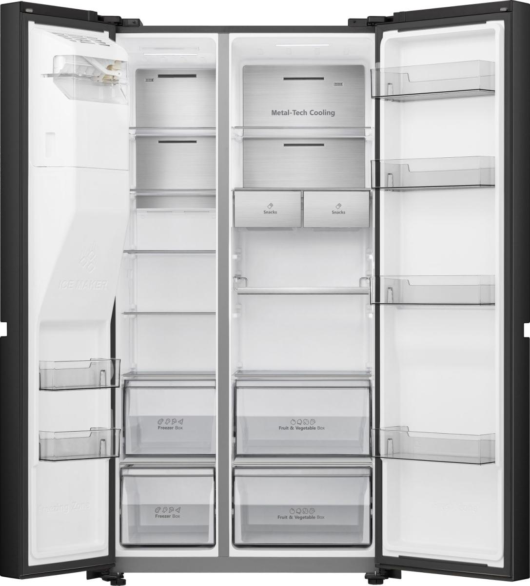 Stel je voor: een warme zomerdag, vrienden over de vloer en jij loopt zelfverzekerd naar je Amerikaanse koelkast. Met één handbeweging vul je een glas met perfect gekoeld water of knisperend verse ijsblokjes. De Hisense RS818N4IFD is niet zomaar een koelkast; het is een statement in jouw keuken. Met zijn elegante zwarte afwerking en royale capaciteit tilt hij jouw dagelijkse keukenervaring naar een hoger niveau. Elke keer dat je de deuren opent, word je begroet door ruimte, overzicht en luxe.